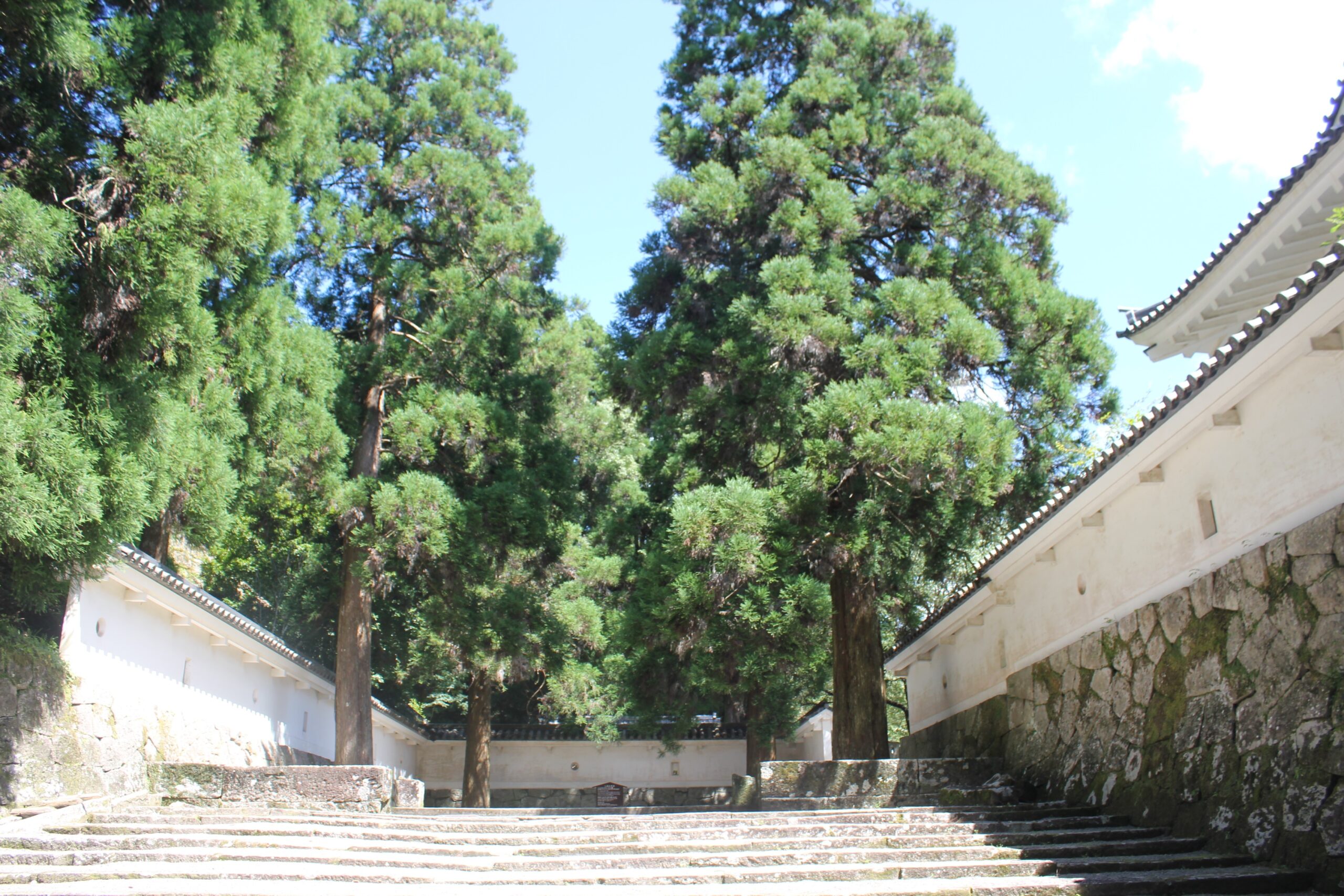 飫肥城跡内の一角に、4本の杉が四方に植えられた「しあわせ杉」。杉が対角線に交わる場所に立つと、幸せの力を授かると伝えられ、パワースポットとして親しまれています。