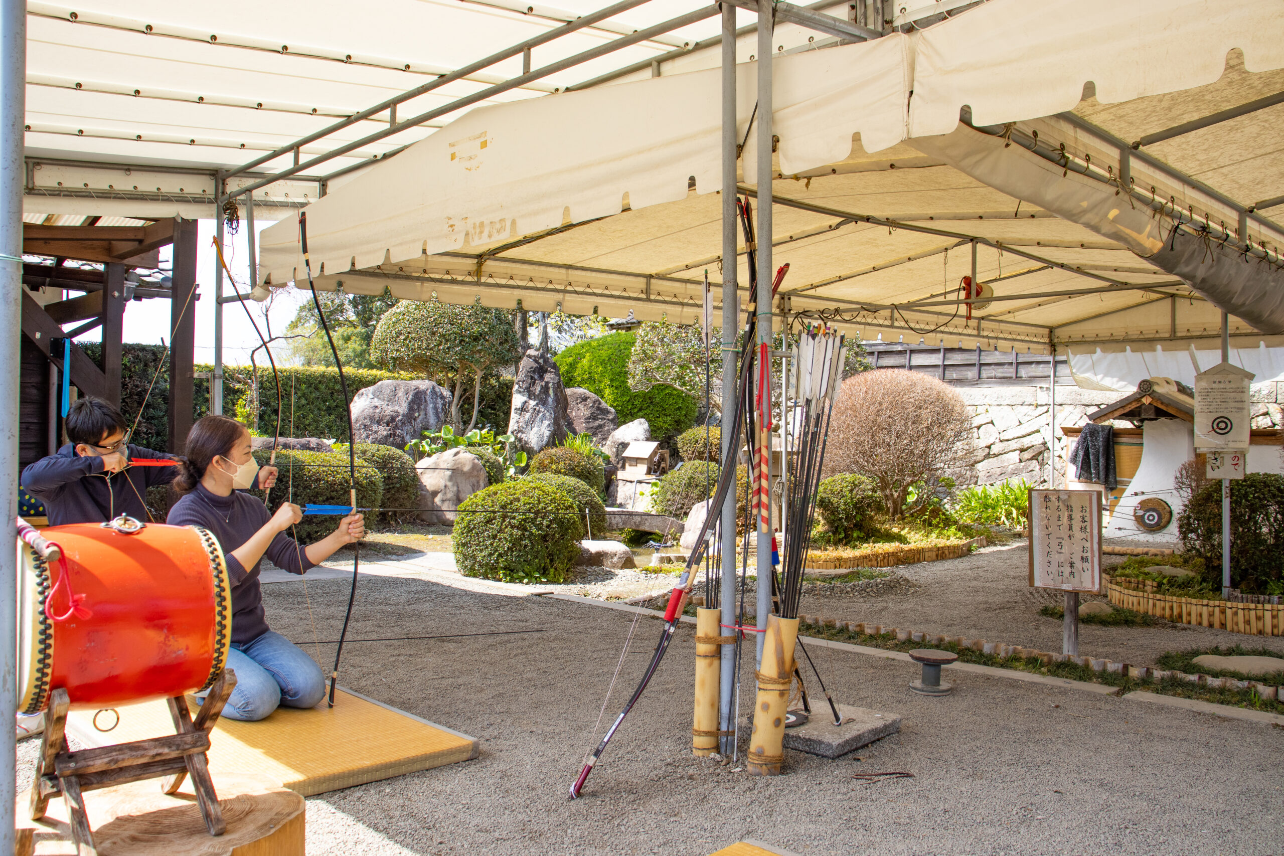 射程や道具の寸法に由来する伝統的な弓の遊び。飫肥では娯楽として親しまれ、城跡や公民館で焼酎を楽しみながら興じる、土地に根ざした文化として今も受け継がれています。