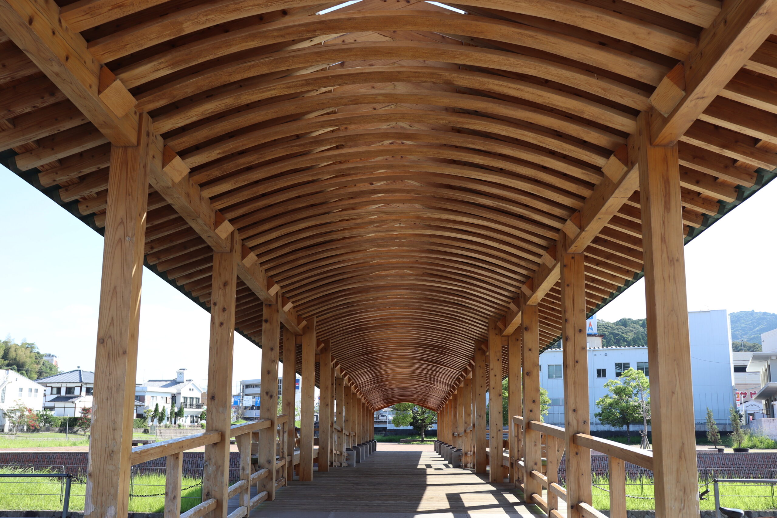 堀川運河に架かる、飫肥杉を使って組み上げた屋根付きの木造橋です。夜にはやわらかな光に照らされて風情があり、川沿いを歩きながら写真映えする景観を楽しめます。