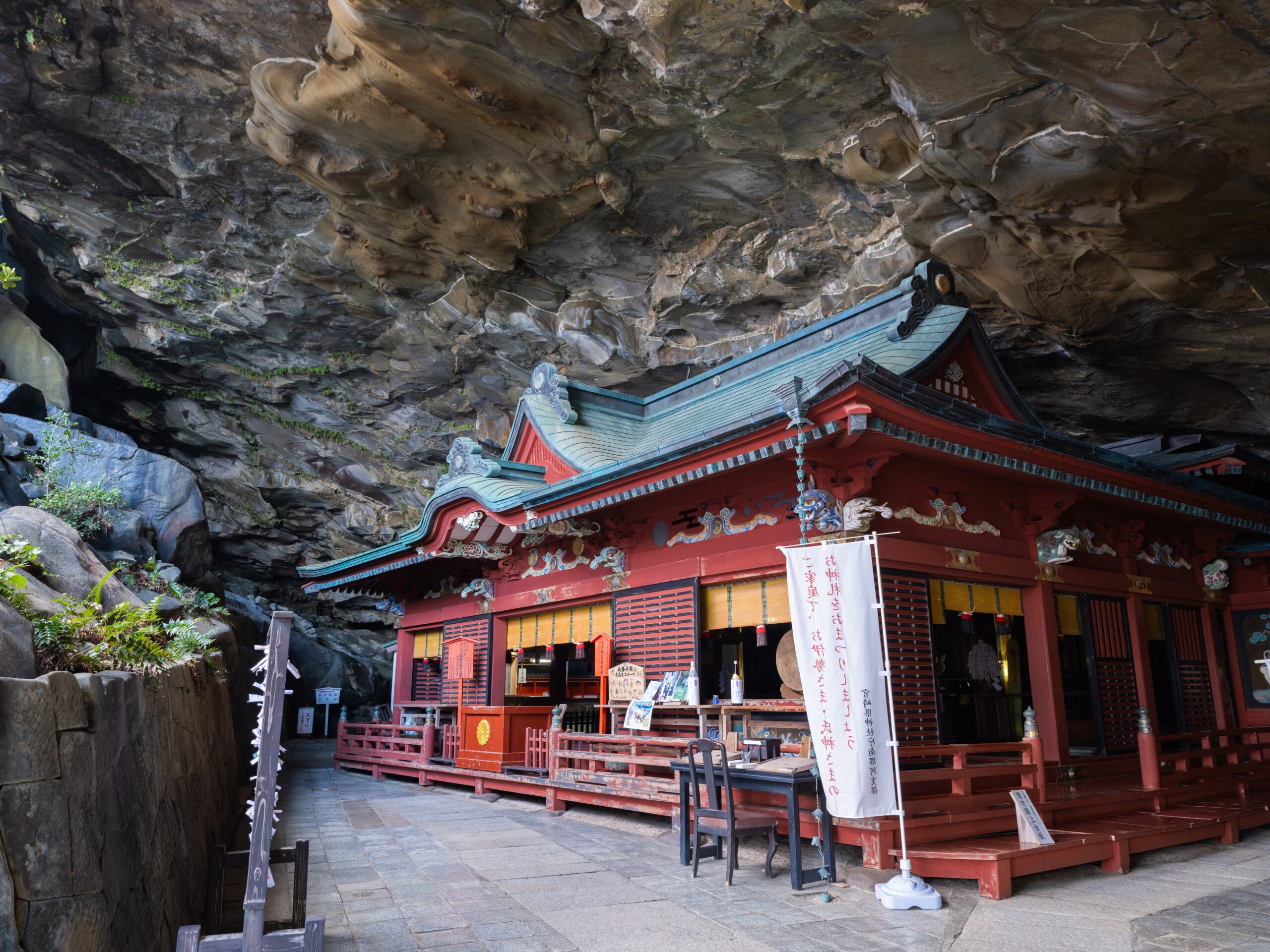 断崖に囲まれた洞窟内に本殿を構える、全国的にも珍しい神社です。日向灘を望む雄大な景色と神話の世界観が調和し、運玉投げなど参拝とあわせて楽しめる体験も魅力のひとつです。